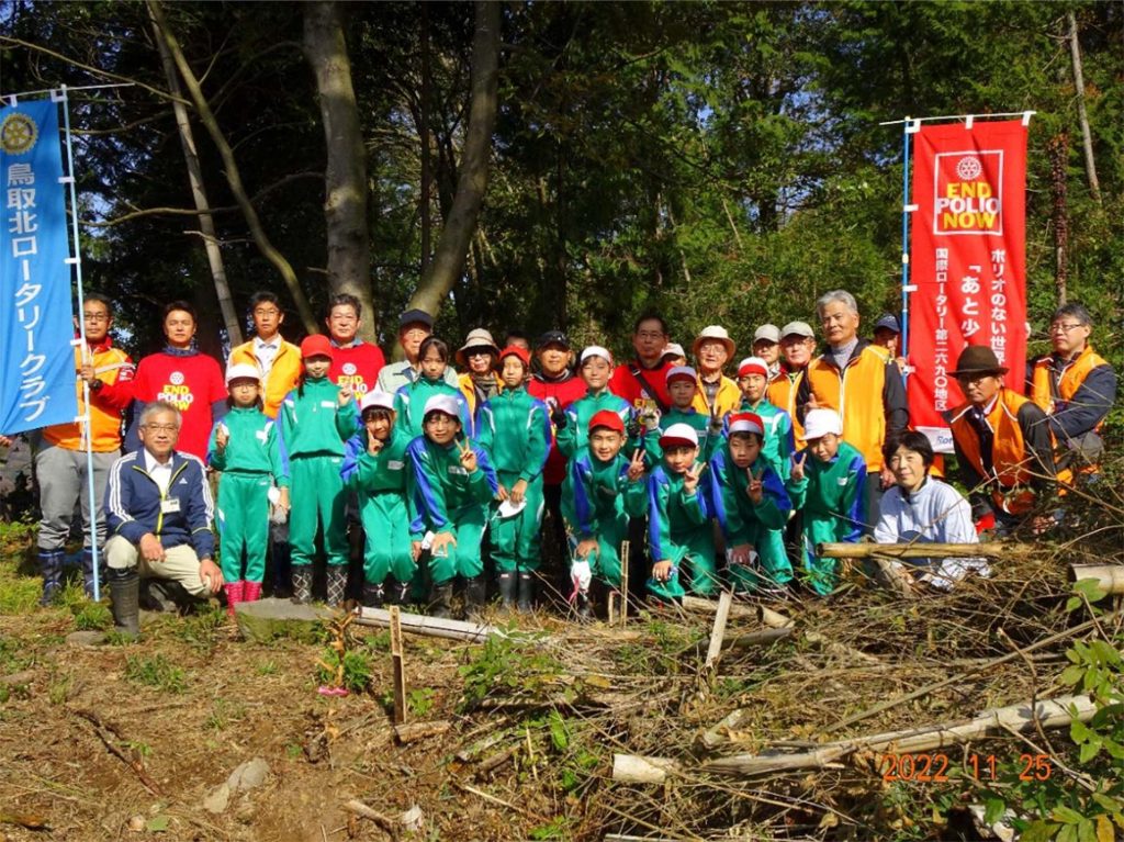 今年で6年目となる里山整備事業を実施しました。鳥取県東部森林組合の協力を得て、2022年11月25日に、鳥取市国府町玉鉾地区にて、国府東小学校5年生の児童と協働でクヌギの苗200本(当日は児童分60本)を植樹しました。