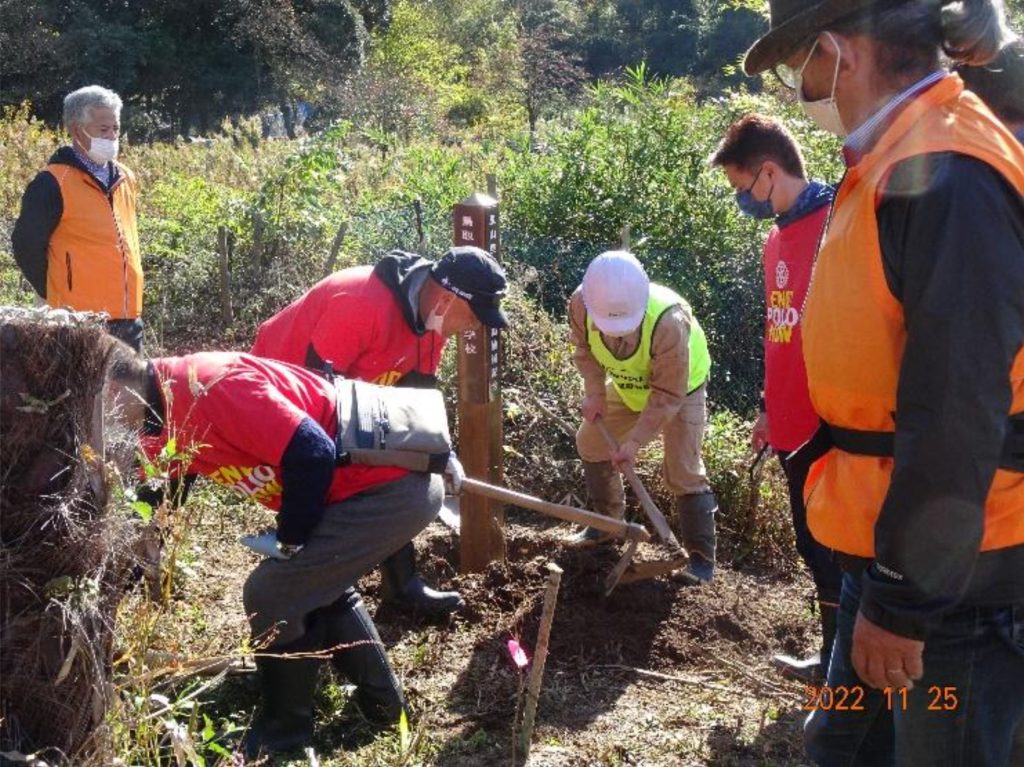 当日は、逢坂小学校に集合し、小林会長から本事業の主旨の説明と参加への謝辞の後、現地へ向かい、ロータリアン・森林組合・小学生混合の4班に分かれて、森林組合職員に植樹の指導をしてもらいながら植樹を行いました。