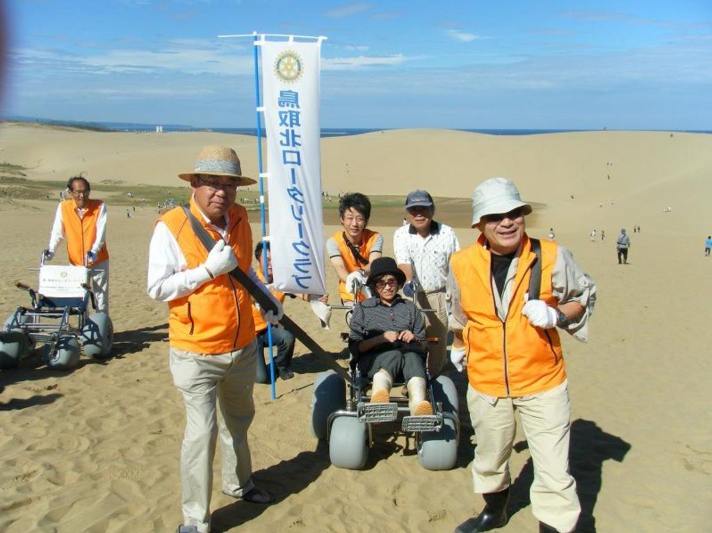 2013年9月29日(日)、鳥取市主催砂丘一斉掃除の日に、一斉清掃の後、砂丘用車椅子の利用希望者(県外からの観光客で高齢者)に乗車していただき、ロータリアンが操作を支援しました。砂丘用車椅子は、砂丘の下り坂では操作しやすかったが、登り坂では2人の操作支援が必要であるため、同車椅子を管理している「鳥取砂丘パークサービスセンター」(自然公園財団鳥取支部、鳥取市福部町湯山)の御厚意により、現在では、登り坂で使用する「曳ベルト」を同車椅子に常時装備したうえで、供用しています。