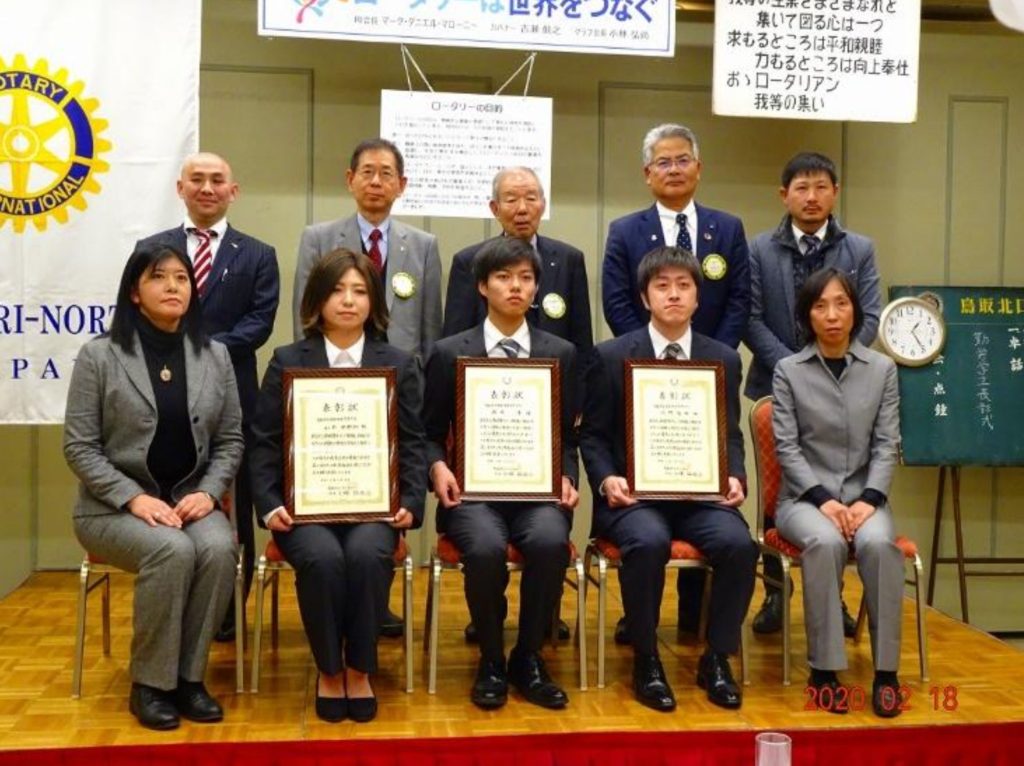 まず、勤労学生の3名の皆さんのご受賞おめでとうございます。北ロータリークラブとしては、1968年の第1回授与式から数えて今年でちょうど50回目にあたり、これまでに総数307名に授与しました。受賞の皆さんは、働きながら勉強をされてきたわけですが、実は私も20代の時に、ある資格を取るために仕事で疲れた体に鞭うって4年間勉強したことがあります。ですから、働きながらの勉強がいかに大変であるかはよく分かります。今のこの努力を、頑張って良かったと思う日が必ず来る事と思います。